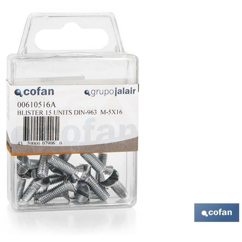 Viti a testa svasata DIN 963 confezionate in blister. Caratteristiche tecniche: Misura: 3,0 x 16 Unità/Scatola: 35