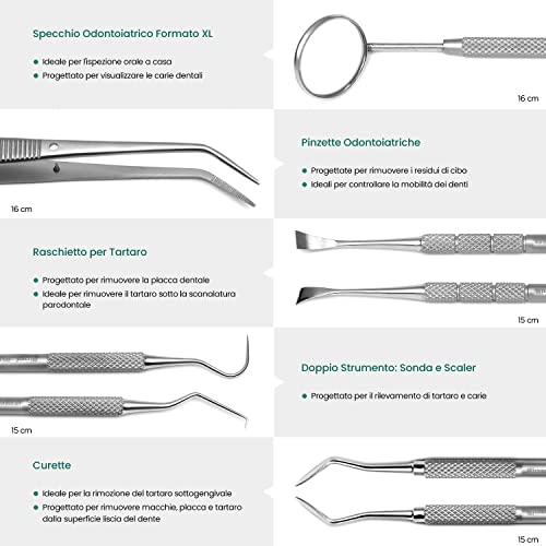 GARANZIA SODDISFATTI O RIMBORSATI: questo set di strumenti dentali della gamma Signature è coperto da una garanzia di rimborso di 30 giorni. La confezione include una custodia in pelle sintetica.