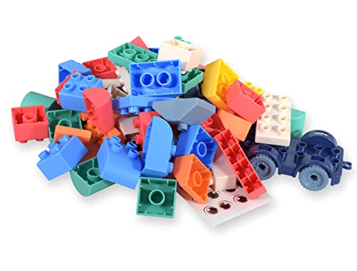 55 blocchi di diverse forme e colori inclusi. Completamente compatibile con LEGO Duplo. Il kit include una forma plastica con ruote (5 pezzi aggiuntivi) per creare veicoli. Include anche una base di 8 x 16 punti (13 x 25 cm). per eseguire i montaggi.