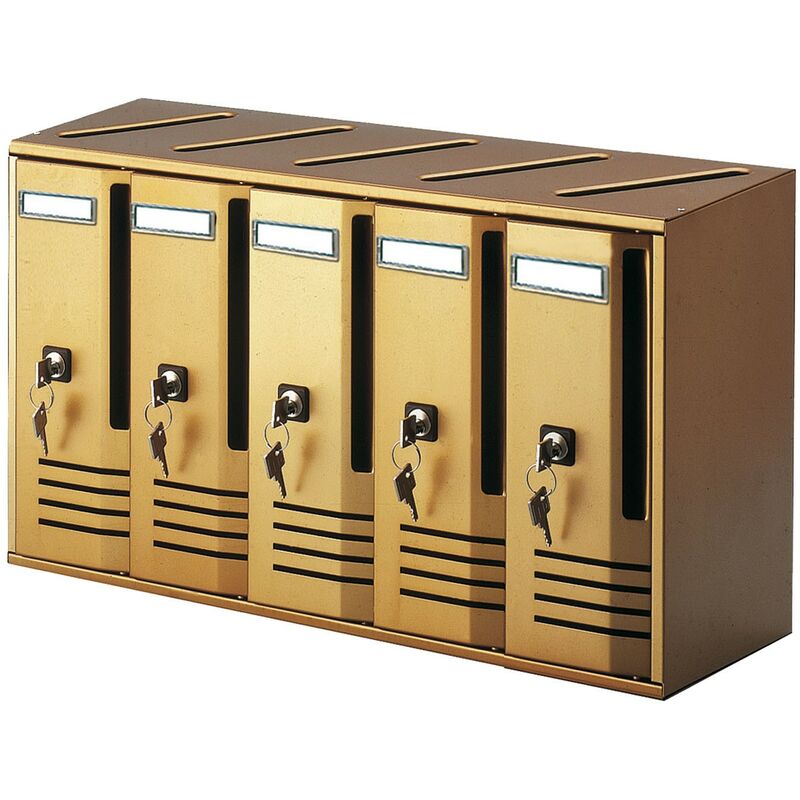 Blocchiere verticali per posta interamente in alluminio color bronzo, componibile, a quattro cassette formato riviste con introduzione della corrispondenza sia anteriormente che da feritoia superiore, con serratura a cilindro con due chiavi Colore: Bronzo Dimensione: L52xP17,5xH30 cm