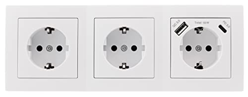 Tre prese con protezione spina / otturatore e 1 x USB-C con PowerDelivery 3.0 18 W e funzione di ricarica rapida, 1 x USB-A 5 V/2,1 A