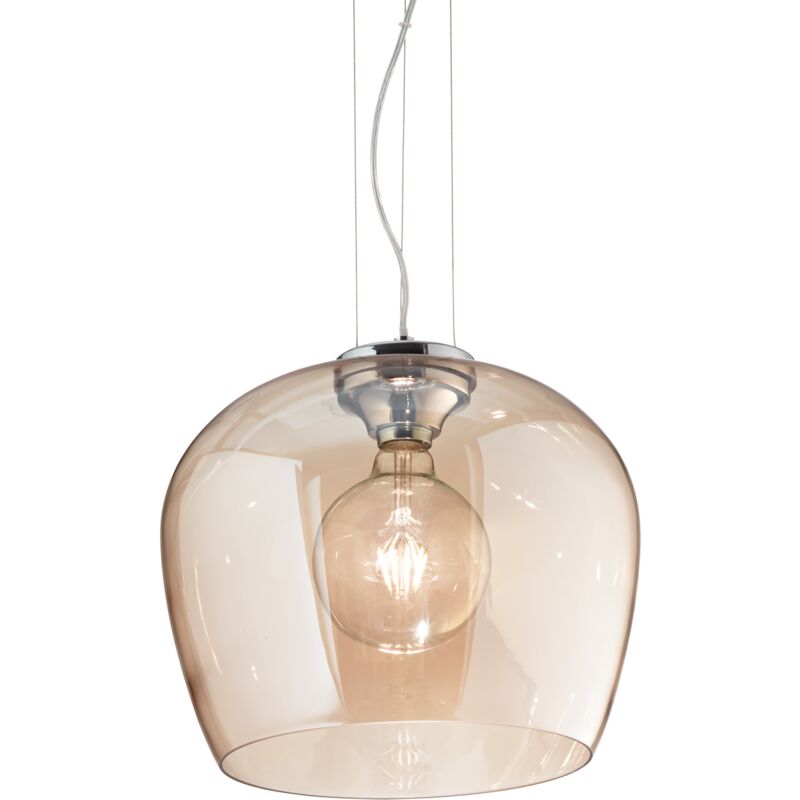 Montatura e rosone in metallo cromato. Diffusore in vetro soffiato trasparente con finitura ambra o fumè. Cavo elettrico in pvc trasparente. Ø 32 x H min 34 / max 243 cm E27 max 1 x 60W IP:20