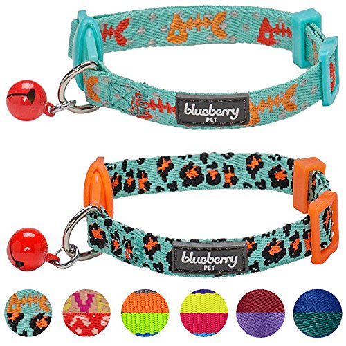 Blueberry Pet Pack of 2 Hunting Expedition with Fish Bone And Leopard Print Adjustable Breakaway Cat Collar with Bell, Neck 23cm-33cm