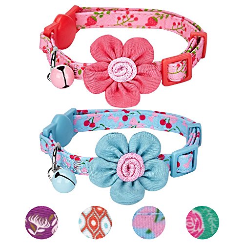Blueberry Pet Pack of 2 Lovely Cherry And Floral Prints Adjustable Breakaway Cat Collar with Flower & Bell, Neck 23cm-33cm