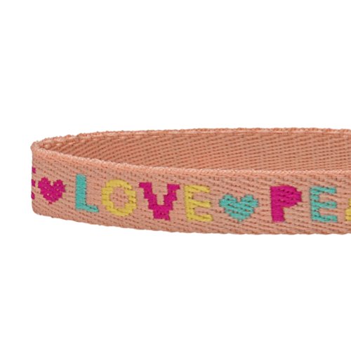 Embedded in the likable pink, letters of love and peace are carefully embroidered, and spaced with loving hearts.