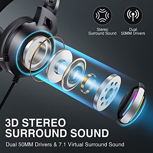 【Microfono Insonorizzato & Suono Stereo Circostante】Parti del microfono aggiunte chip di riduzione del rumore IC,Dotato anche di driver da 50 mm di alta precisione,con una vasta gamma di suoni ambientali e precisione di posizionamento acustica, può catturare chiaramente il suono del tuo gioco o della chat online, portando un'esperienza di gioco coinvolgente.