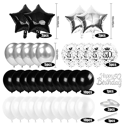 : 1 numero in lamina d'argento [50], 10 palloncini bianchi, 10 palloncini neri,5 x palloncini stampati 50, 2 palloncini a stella in lamina nera, 2 palloncini a stella in foglia argento, 1 "Happy 50th Birthday", 2 nastri d'argento.