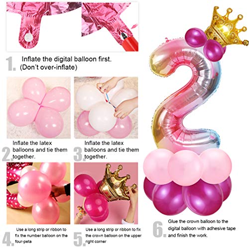 ❤ Squisita decorazione di 2 anni compleanno: Include palloncini in lamina rosa con numero "2", 1 mini corona, 12 palloncini in lattice (4x rosa rossa da 10 pollici, 4x rosa chiaro da 10 pollici, 4x rosa rossa da 5 pollici), 2x palloncini lunghi, 1x adesivo rotondo.