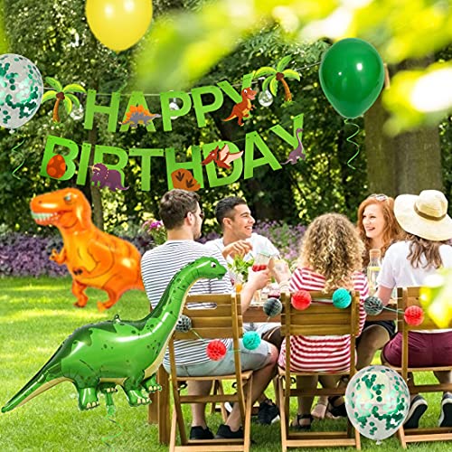 Set compleanno dinosauro: 6 palloncino foil verde XXL (101 cm), 30 palloncini in lattice (6x verde scuro, 12x verde, 1x giallo, 1x coriandoli verdi), 1 palloncino tirannosauro, 1 palloncino dinosauro collo lungo, 1 ghirlanda di buon compleanno dinosauro, Cake topper dinosauro 9 pezzi, 2 fasce verdi .