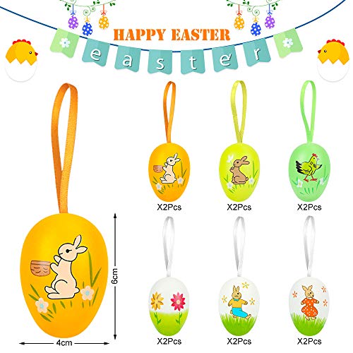 12 pezzi di uova decorative, ci sono diversi stili nell'intero set, sono verdi, gialli, arancioni, ecc.E il design di stampa include conigli, pulcini, fiori, erba delle farfalle e altri temi pasquali a tema primaverile, la bella decorazione pasquale è l'ideale, per decorare il giardino, il balcone o il bouquet pasquale in appartamento!