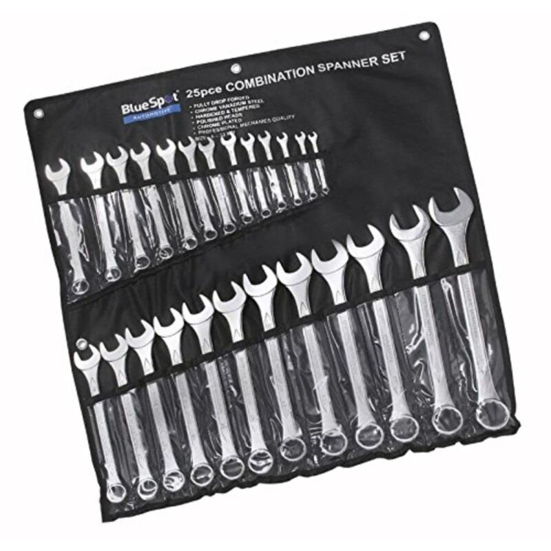 This 25 piece set comprises the following sizes: 1 each - 6, 7, 8, 9, 10, 11, 12, 13, 14, 15, Blue Spot Metric cromo vanadio, set chiave combinata placcati con specchio bonificato teste lucidate. Nichel cromato. Fornita in una valigetta in plastica / contenitore robusto e disposte in ordine di grandezza Contenuto:. B / S04111: 6, 7, 8, 9, 10, 12, 13, 14, 15, 17 & amp, . 19 millimetro B / S04125: 6, 7, 8, 9, 10, 11, 12, 13, 14, 17, 19, 22, 24 & amp, . 26 millimetro B / S04131: 6, 7, 8, 9, 10, 11, 12, 13, 14, 15, 16, 17, 18, 19, 20, 21, 22, 23, 24, 25, 26, 27, 28, 30 & amp, 32 millimetri.