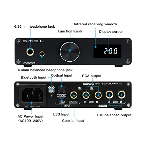 SMSL C200 Bluetooth DAC Amplificatore per cuffie: ES9038Q2M 4x OPA1612 XMOS XU216 DSD512 PCM768kHz DAC USB/OPT/COAX/BT Ingresso TRS/RCA/4.4mm/6.35mm Uscita Home Desktop HiFi DAC AMP per PS4 PS5