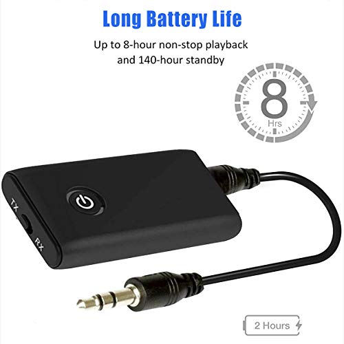 【Durata】Ricevitore e trasmettitore Bluetooth con batteria al litio ricaricabile integrata da 300 mAH. Batteria integrata del trasmettitore Bluetooth viene caricata tramite USB. Dopo essere completamente carico, può essere riprodotto ininterrottamente per 6-8 ore e di caricarsi completamente in circa 2 ore, goditi i tuoi contenuti wireless preferiti in qualsiasi momento.