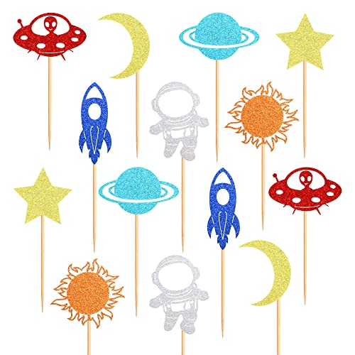 Blumomon 28 pezzi Space Astronaut Cupcake Toppers Rocket Planet Trip to the Moon Cupcake Picks Baby Shower Ragazzi Ragazze Compleanno Spazio Esterno A Tema Festa Decorazioni Forniture