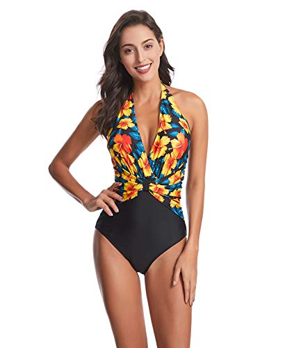Bmeigo Donna Un Pezzo Costumi Interi da Bagno Monokini Halter Strap Floreale Leopardo Stampa Cinghietti Beachwear Nero Giallo