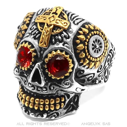 BOBIJOO JEWELRY - Anello Anello Uomo Testa di Morte Teschio Biker Maya Croce Acciaio Oro Gli Occhi Rossi - 24 (11 US), Acciaio Inossidabile 316