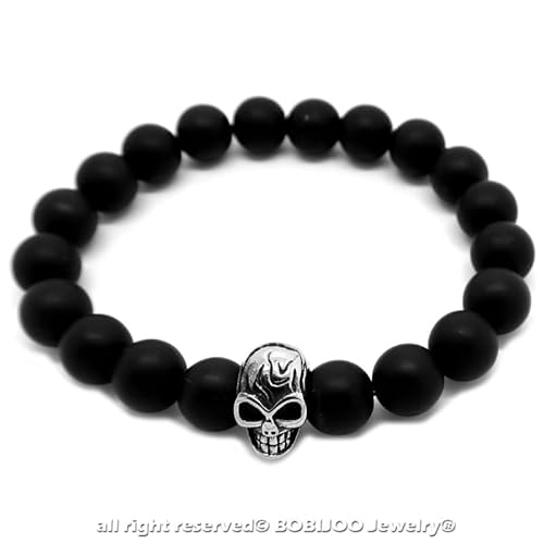 BOBIJOO JEWELRY - Bracciale Tondo Pietre di Onice Nero Opaco 10mm Testa di Morte Teschio d'Argento in Acciaio Inox 316L