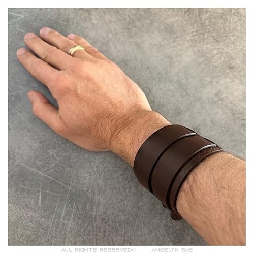 Misura 5 cm di larghezza per una lunghezza totale di 27 cm. Questo gioiello in pelle è adatto per un polso da 17 a 23 cm.