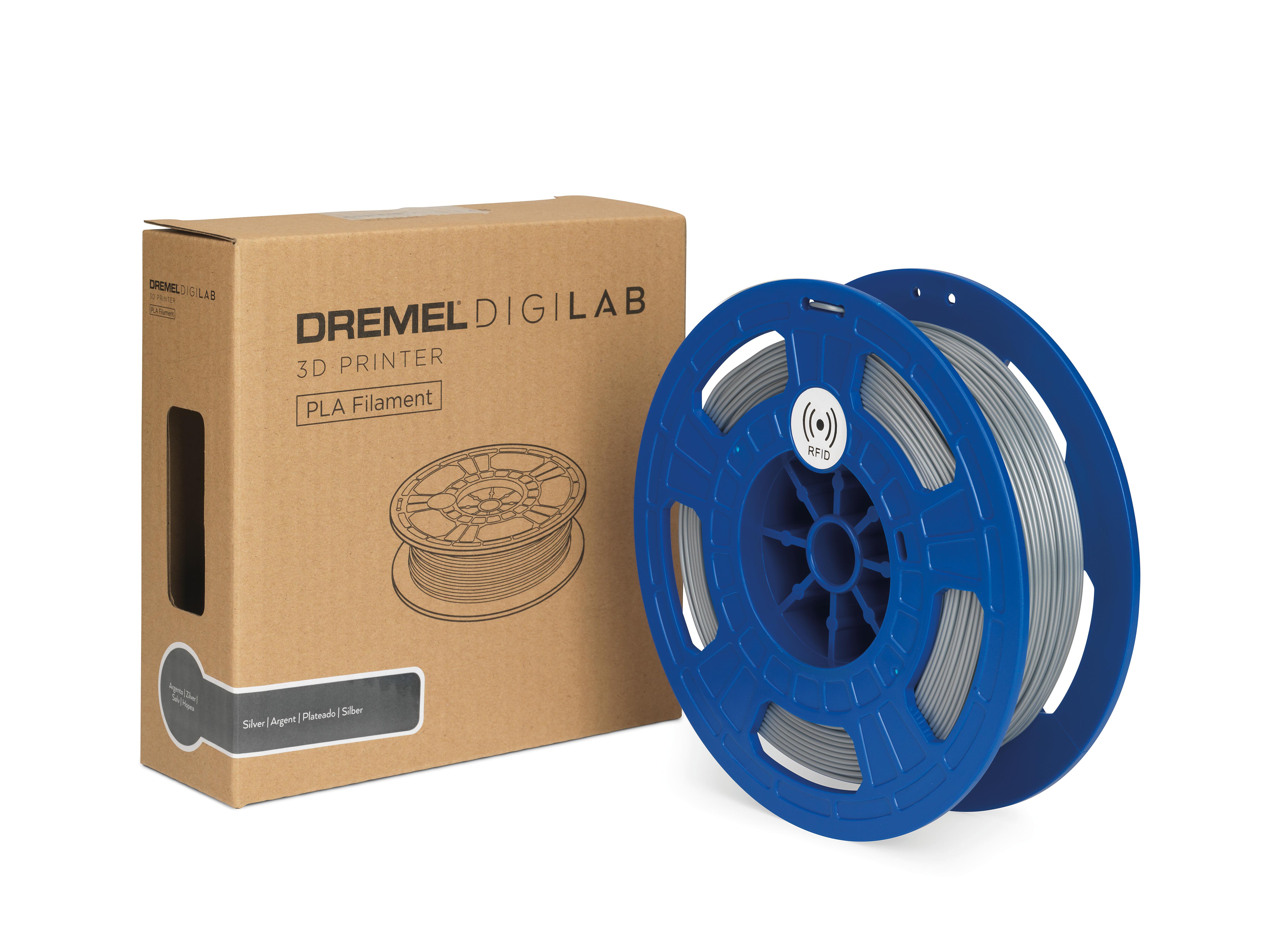 Filamento per stampante 3D Dremel in PLA Argento, 750g, RFID. Perfetto da utilizzare con le stampanti Dremel 3D40 e 3D45.. Targhetta di riconoscimento RFID per regolazione automatica delle impostazioni di stampa (3D45)