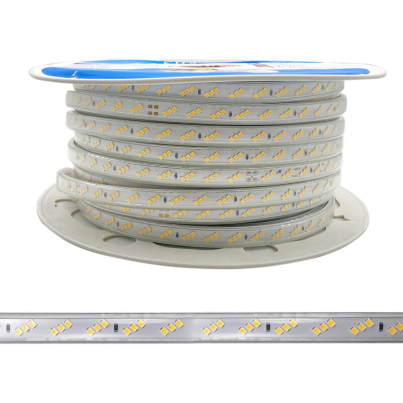 BOBINA 50M STRISCIA LED 220V IP65 180LED/M 11W/M TRIPLO LED SILAMP Bobina 50 metri triplo filo led 2835 ad alta efficienza consuma solo 11W per metro. La luce che emette è distribuita con un angolo di 120°. Questa striscia LED 220V può essere tagliata ad ogni 100 cm (1 metro), negli spazi adibiti al taglio, ossia dove troverete le interruzioni della striscia led o il simbolo delle forbici. Per una perfetta protezione IP65, questi punti di connessione devono essere adeguatamente protetti. La striscia a led NON è adesiva, inclusa nella confezione troverete delle clips di fissaggio. Inoltre, ogni bobina è compresa di 3 cavi raddrizzatori e 3 tappi terminali. Non necessita di trasformatore e si collega direttamente alla corrente domestica 220V, è perfetta per decorare sia spazi esterni che interni, può essere utilizzata per illuminare facciate, vetrine o armadi, scaffali, soffitti o scale ed altri usi. AVVERTENZA: Non provare la bobina ancora arrotolata per più di 5 minuti, essendo molto