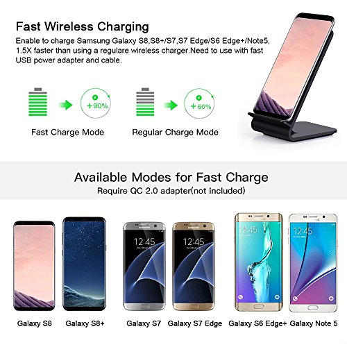 Compatibilità Universale: due modelli per la ricarica senza fili:(1) veloce carica modello (uscita 10W Max) per il vostro Galaxy S8, S8 Plus, S7, S7 Edge, S6 Edge +, Note 5, Note 8. (2) Standard carica Model (Output 5W Max) per il tuo QI standard abilitato dispositivo come iPhone X/8/8 Plus, S6, S6 Edge.