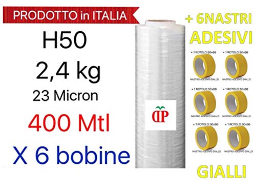 6 BOBINE Pellicola Film in Polietilene per Imballo Imballaggi H 50 cm in Rotolo da 400 mtl spessore 23 micron peso 2,4 kg + 6 ROTOLI NASTRO ADESIVO 50x66 GIALLO PPL SILENZIOSO