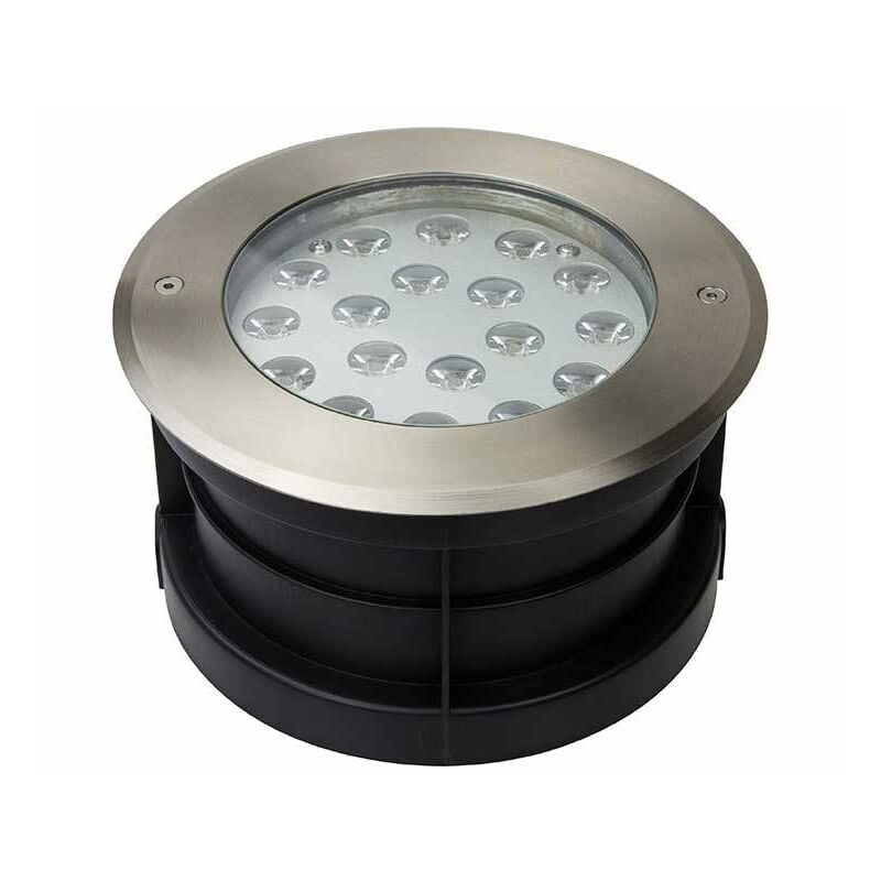 Faretto LED da incassare nel terreno, che emette luce RGB multicolore, ideale per illuminare facciate, colonne, edifici, giardini, scale, patii, terrazze e molte altre applicazioni, grazie al fatto che concentra la luce con un angolo di 30°. Si tratta di un faretto da incasso particolarmente adatto all'uso esterno grazie al suo grado di protezione IP67. Illumina qualsiasi struttura architettonica con luce colorata, evidenziandone la posizione e decorandola. Percorribile fino a 100 kg - adatto al traffico pedonale. Alimentazione e controller RGB non inclusi 18W - 12VDC Ø210x72 mm ✂197mm IP67
