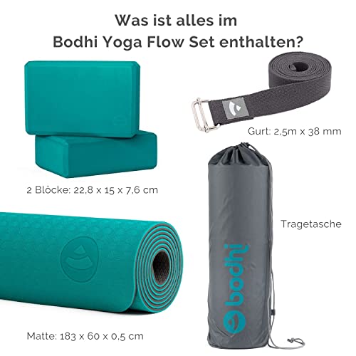 Bodhi Set completo di base per yoga | Set composto da: 1 tappetino da yoga in TPE, 2 trucchi da yoga in Eva (gommapiuma) e 1 cinghia da yoga in cotone | Set per principianti per yoga (petrolio)