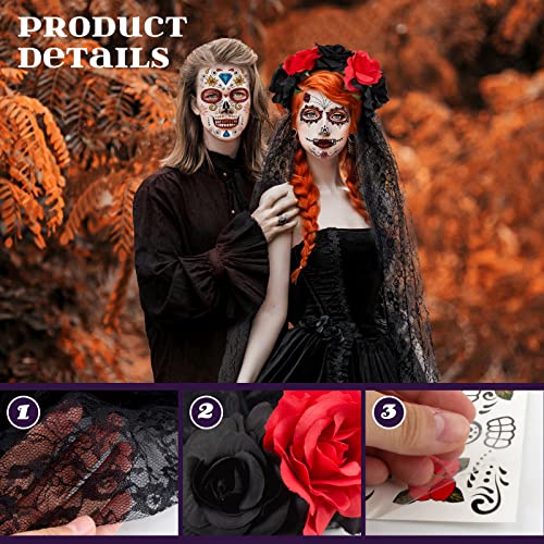 BOFUNX Cerchietti Rose di Halloween con Velo Fascia Fiore di Halloween per Capelli con Halloween Tatuaggi Viso Temporanei Sposa Zombie Accessori per Halloween Giorno dei Morti