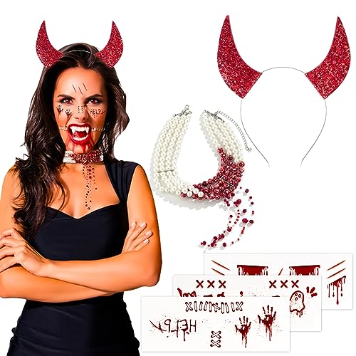 BOFUNX Orecchie Diavolo Fascia per Capelli Diavolo Corna da Diavolo + Collana di Perle con Sangue + Tatuaggi Temporanei Halloween Travestimento per Halloween Cosplay Bambini Adulti