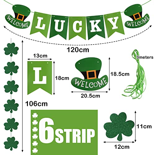 ☘️【Dimensione】Striscione LUCKY: 13 * 18 cm, 20,5 * 18,5 cm. Ghirlande di carta trifoglio: 106 cm. Nastro: 3 m.
