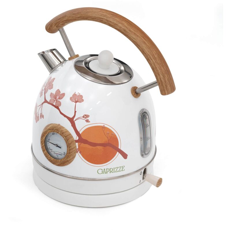 Un grande design unito alla migliore qualità. Il bollitore ad acqua calda ha una potenza elevata che consente di riscaldare l'acqua a 100° in 5,30 minuti, in modo da poter gustare rapidamente il proprio infuso preferito. È dotato di un filtro anticalcare rimovibile e lavabile che garantisce acqua pulita e insapore. La sua grande capacità di 1,8 l consente di non dover riscaldare costantemente l'acqua. Inoltre, il suo design vintage con finiture opache e in legno aggiungerà un tocco di originalità alla vostra cucina. Questo bollitore in acciaio è dotato di un termometro integrato per controllare la temperatura e di una finestrella per individuare la giusta quantità di acqua. Il suo sistema di spegnimento automatico è in grado di rilevare il surriscaldamento e di spegnere il dispositivo. Caratteristiche: - Dimensioni: 25x21x27,5 cm. - Materiale: acciaio inox e polipropilene. - Senza BPA - Capacità: 1,8 L massimo. - Colore: bianco opaco con decorazioni rosse e arancioni e dettagli