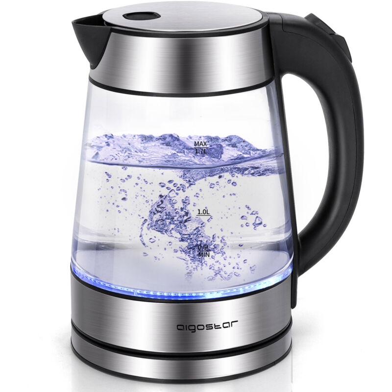 Bollitore in vetro con filtro rimovibile e led blu 1.7 Lt | Aigostar Chubby Bollitore in vetro borosilicato da 1,7 litri (per 3-5 persone) con illuminazione led blu e filtro rimovibile . Pratico e sicuro Il coperchio ad ampia apertura, il filtro rimovibile e l indicatore del livello d acqua rendono questo bollitore pratico e sicuro. Grazie al manico ergonomico e resistente al calore, non dovrai preoccuparti di scottarti. Inoltre il termostato di alta qualit garantisce lo spegnimento automatico e la protezione dalla bollitura a secco. Il filtro rimovibile lo render facile da pulire. Il bollitore realizzato con materiali di altissima qualit per la sicurezza di tutta la famiglia: il vetro borosilicato resistente alle basse e alte temperature, resistente alla corrosione e antiscottatura. Illuminazione LED L'illumianzione LED accesa indica che il bollitore in fase di riscaldamento. Con una capacit massima di 1,7 litri, l'acqua raggiunge il punto di ebollizione in pochi minuti.