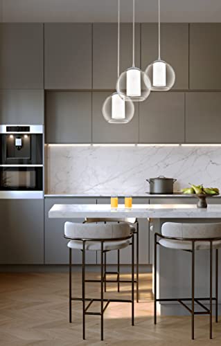 La lampada a sospensione in acciaio cromato con un paralume decorativo in vetro laccato bianco e una decorazione in erba cromata, si inserisce elegantemente nella tendenza moderna