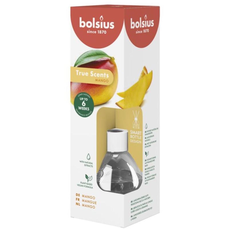 La fragranza Bolsius True Scents Exotic Mango si attacca al profumo duraturo del mango. Completamente a base vegetale. Contenuto: 60 ml.