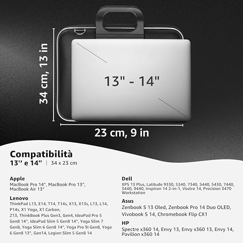 [DIMENSIONI] - Può ospitare laptop o tablet da 13 pollici. La borsa computer misura 38x29x7cm e pesa 0,700 Kg.