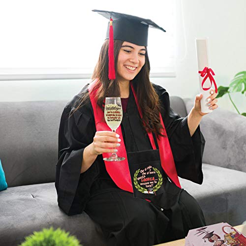 Il Bicchiere con portabicchiere per Laureata è inserito in una tasca da collo in Tnt di cm. 18x22 di colore nero con soffietto sul fondo, la simpatica stampa sul portabicchiere aggiunge allegria e gioia a questa festa.