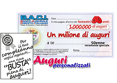 Si tratta di un particolare biglietto di auguri che ricorda un assegno. La banca emittente è la B.A.C.I. (Banco Augurale Credito Italiano). L'assegno deve essere compilato con data, nome del festeggiato e firma