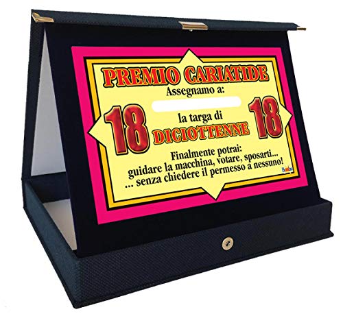 Targa premio di cm.21x17 esterno in t.n.t. interno velluto,unisex. Un premio simpatico e divertente da assegnare al/alla neo diciottenne che oggi festeggia quest'importante avvenimento.Insignite il/la protagonista della festa con frasi altisonanti, celebrate la premiazione con simpatiche battute ed aneddoti sulle difficoltà e gli impegni che da oggi lo/la aspettano, e il successo della festa sarà assicurato.Festeggiate questa importante giornata con questo gadget che può essere personalizzato