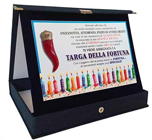 Targa premio di cm.21x17 esterno in t.n.t. interno velluto, con attaccato un corno portafortuna. Un premio simpatico e divertente da assegnare all'amico che festeggia il suo compleanno. Insignite il protagonista della festa con frasi altisonanti, celebrate la premiazione con simpatiche battute ed aneddoti, e il successo della festa sarà assicurato. Festeggiate in allegria con questo divertente ed umoristico gadget, un modo diverso per fare degli auguri e....augurare buona fortuna!.