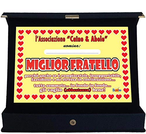 Targa premio di cm.21x17 esterno in t.n.t. interno velluto. Un premio simpatico e divertente per celebrare un fratello, l'amicizia e l'amore che vi lega.Insignite il protagonista della festa ricordando le sue doti,le sue qualità, la sua eccezzionalità con frasi altisonanti, celebrate la premiazione con simpatiche battute e divertenti aneddoti,completate con tanti tanti auguri, ed il successo sarà assicurato.La possibilità di personalizzare la targa con il nome del festeggiato è importante,nel