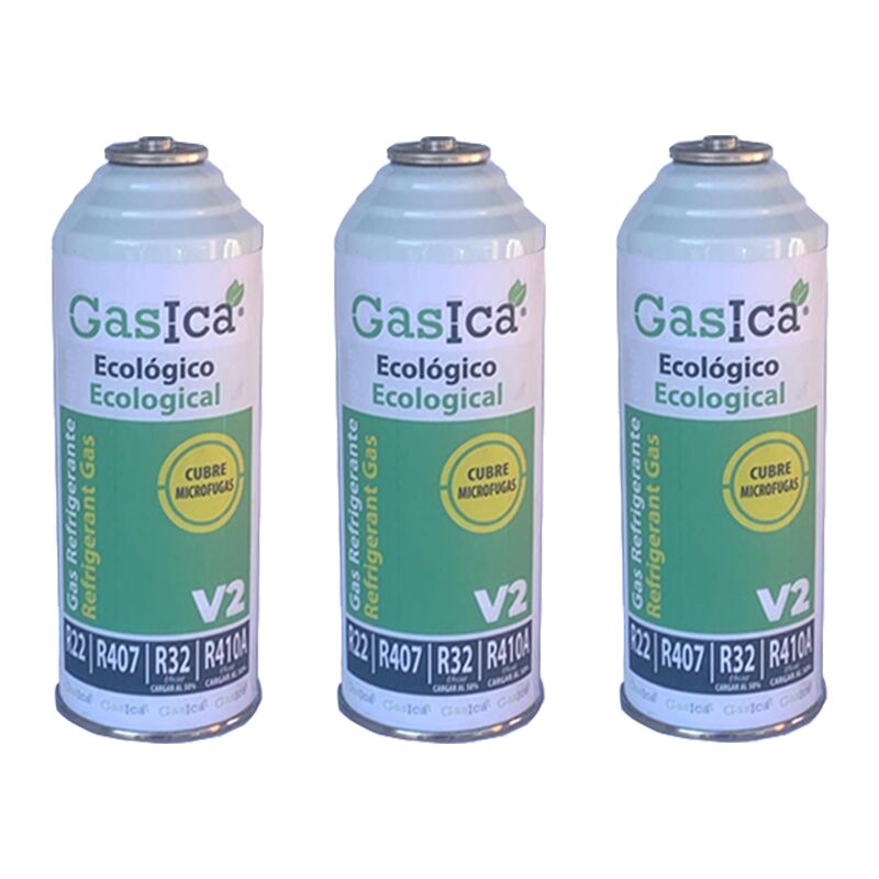 PACK 3 BOTTIGLIE. 226Gr V2 REFRIGERANTEÊECOLOGICO. SOSTITUTO R22, R32, R410a R407c EFFICIENTE gas refrigerante Gasica 226Gr. Per i sistemi con R22 - R32 - R407c - R410a - 100% ‡ nico org. gas è un nuovo norteamericanaÊSUMGAS eco-tecnolog'a Ecol a base di logiche. Il suo F-FORMULA (HC