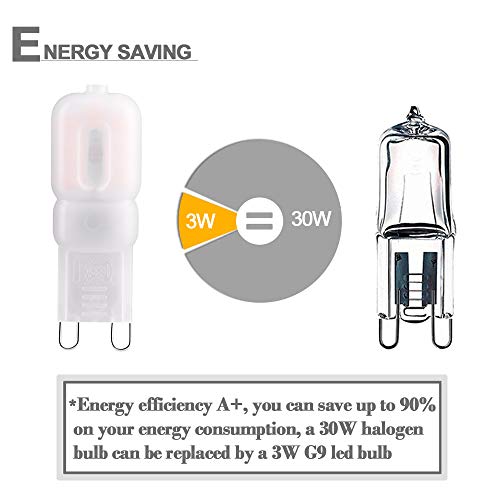 Durata Della Vita Lunga Lampadine G9 LED: Il LED da 3 W sostituisce le lampadine a incandescenza e alogene da 30 W, risparmiando fino al 90% sulla bolletta dell'illuminazione elettrica, la durata della vita è di fino a 30.000 ore,lil che contribuisce notevolmente a ridurre la frequenza di sostituzione della lampada
