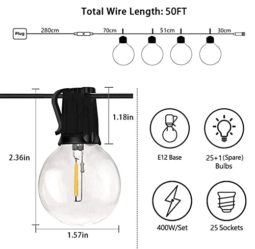 15M Catena Luminosa Esterno: Luci da esterno LED impermeabili con 25 prese sospese, a 1,64 piedi di distanza per una lampadina, 25 lampadine LED E12 G40 da 1W e 1 di ricambio incluse. Lampadine LED ad alta efficienza per risparmiare oltre il 90% di energia rispetto alle lampadine a incandescenza. Una durata di 20.000 ore potrebbe ridurre i costi di manutenzione per la sostituzione frequente delle lampadine.