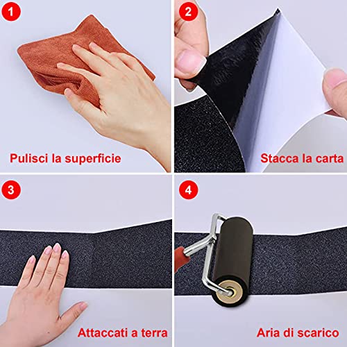 Facile da installare: puoi utilizzare il nastro antiscivolo a casa e in altri luoghi. Tutto quello che devi fare è tagliare un pezzo della lunghezza che ti serve, staccare la carta e applicare il nastro adesivo su una superficie pulita e asciutta. Il nostro nastro adesivo antiscivolo misura 50 mm x 10 m e può essere tagliato nella misura appropriata.