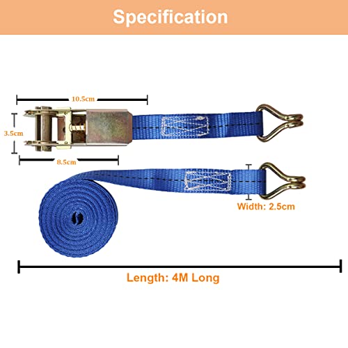 Cinghie a cricchetto pesanti: Cinghia di tensione 4m di lunghezza e 25 mm di larghezza, cinghie di tensione pesanti con 4 fibbie a cricchetto in metallo e 4 ganci a J. Capacità di carico: 500 lbs, resistenza alla rottura: 1700 lbs.