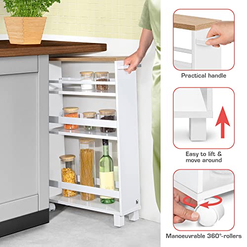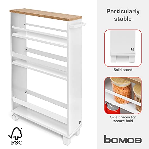 Bomoe Carrello da Cucina Bianco Quercia Hylla - scaffale da Cucina 50x79x15 cm - Carrello con Ruote, 3 ripiani e piano lavoro in legno FSC® - Carrello da portata - mobile da Cucina e da Bagno