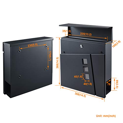 36,8 x 36,8 x 10 cm. Dimensioni della cassetta delle lettere: 36,8 x 36,8 x 10 cm. La cassetta delle lettere da parete offre spazio sufficiente per la posta e i giornali. Con uno scomparto extra grande e un pratico scomparto per giornali, i nostri prodotti possono essere facilmente lettere, giornali, riviste