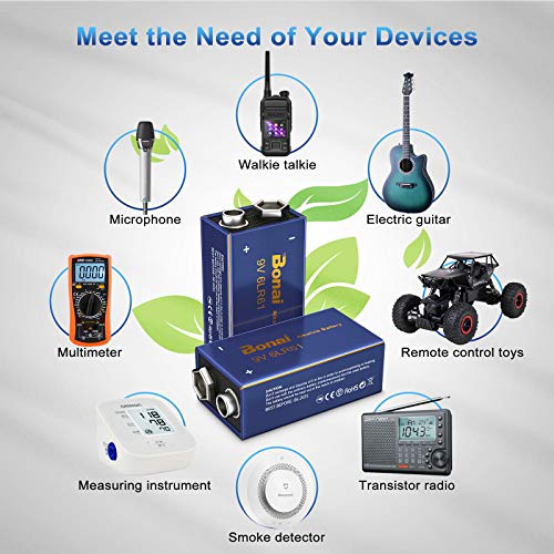 Batterie a blocco BONAI 6F22 600mAh 9V, 12 pezzi batterie alcaline 6LR61 9V soddisfano tutte le normative di sicurezza e ambientali, non contengono sostanze nocive come Hg/Cd/Pb. Per range di temperatura da -10°C a +50°C. Offri una scatola di imballaggio ecologica in tinta unita. Nota: queste batterie non sono ricaricabili.