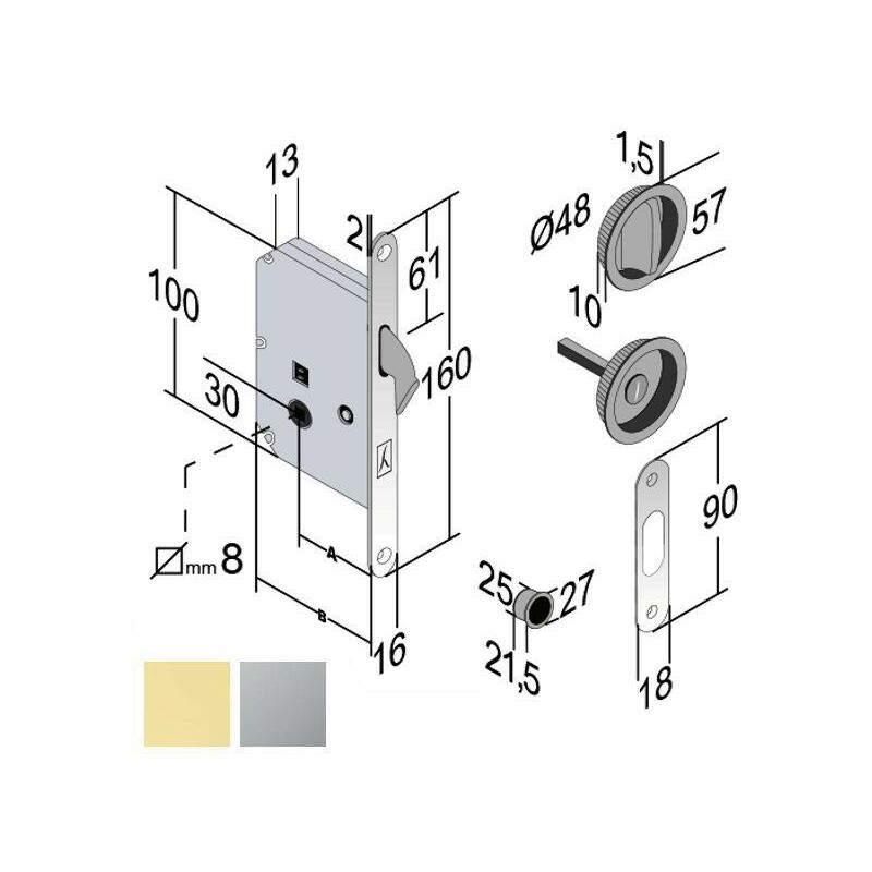 Serratura infilare porte scorrevoli Catenaccio a gancio Quadro bagno mm 8 riducibile mm 6 Frontale bordo tondo mm 16x160 Incontro mm 18x90 Scatola mm 70x100 spessore 13 - Entrata mm 50 Coppia maniglie tonde mm 48 incasso Maniglia trascinamento